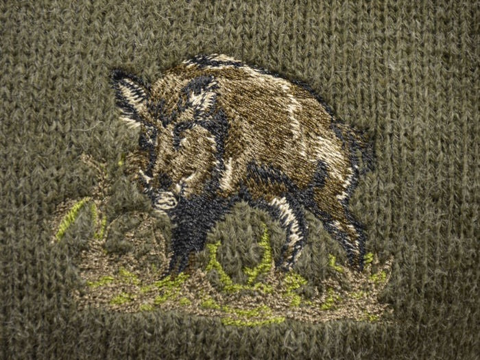 Wollstrickpullover mit Schwarzwild-Stick auf der linken Brust.