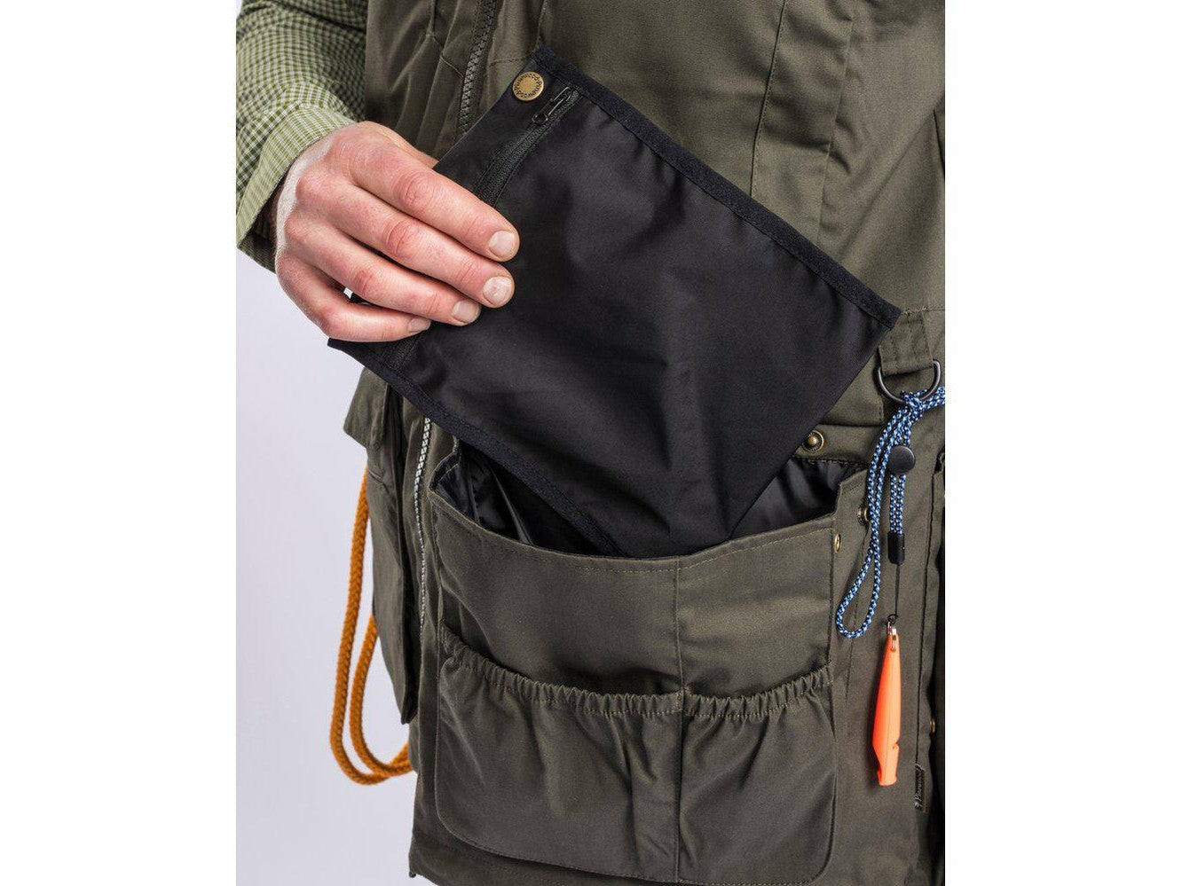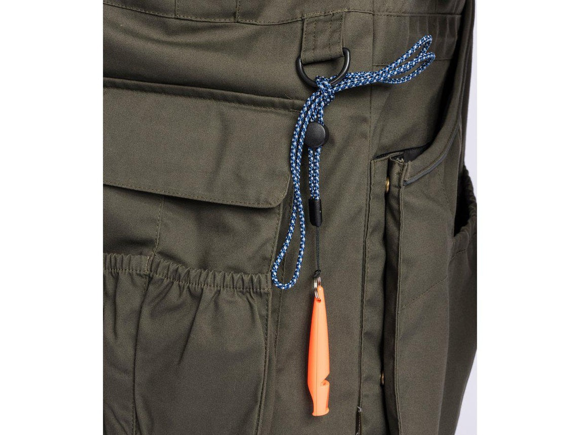 Die Weste lässt sich reibungslos mit einem 2-Wege-Reißverschluss schließen und kann am Rücken und unten mit einem versteckten Zugband angepasst werden. Im Taillenbereich finden Sie sowohl einen D-Ring als auch einen robusten Karabinerhaken, ideal zum Befestigen von Leinen oder ähnlichen Gegenständen.