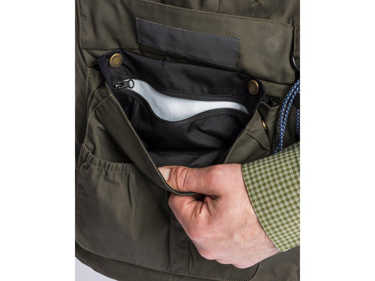 Die Weste ist sowohl wasserabweisend als auch winddicht und verfügt über eine gewachste Oberfläche, die leichten Regen standhält.