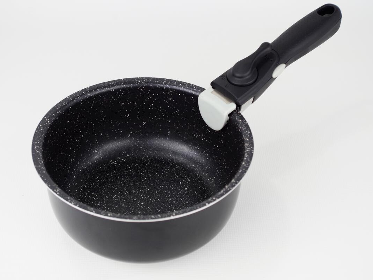 Abnehmbarer Sicherheitstopfgriff geeignet für alle Töpfe und Pfannen. Doppelte Sicherheitsverschluss verhindert ein ungewolltes Öffnen.